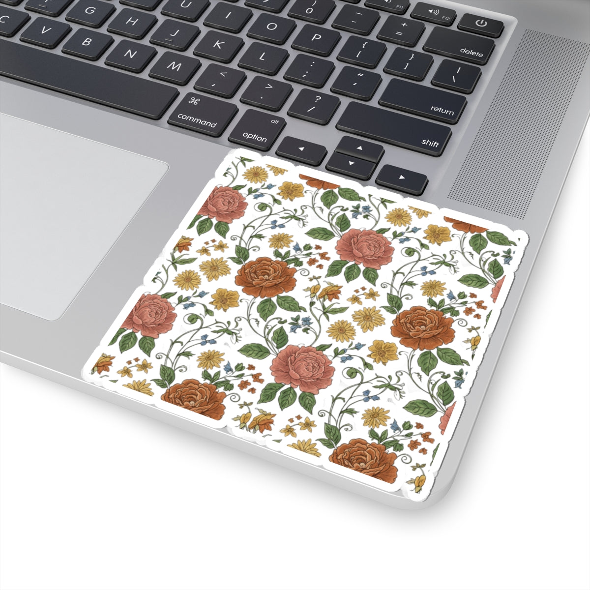 Warm cottage-floral sticker featuring a repeating folk-inspired pattern of rust and muted rose blooms, mustard accents, and winding green vines. The vintage wallpaper feel and soft earth-toned palette create layered coziness for décor-minded shoppers who favor rustic floral pattern and folk repeat aesthetics. Use on laptops, journals, and smooth indoor surfaces to introduce a continuous, homey floral motif that complements cottage and vintage-inspired spaces.